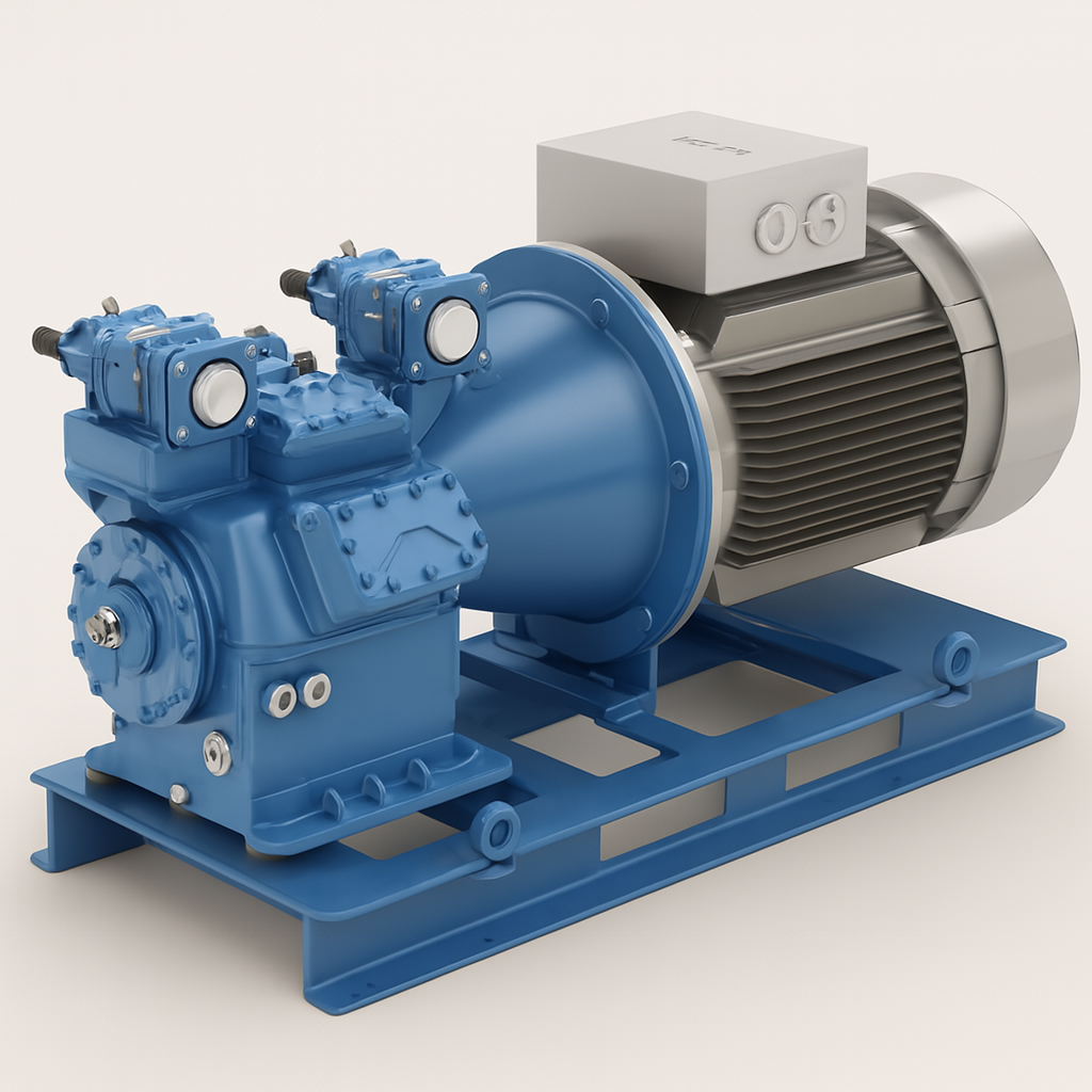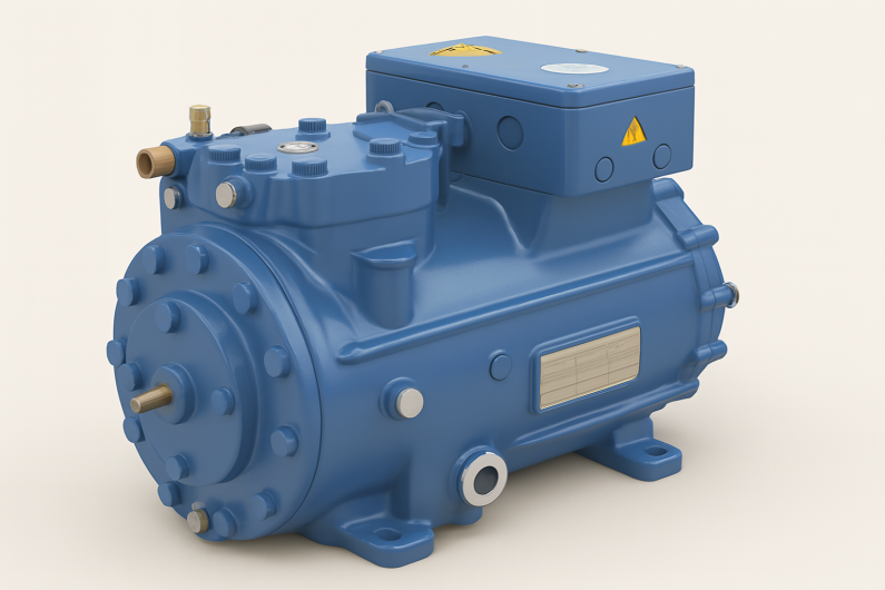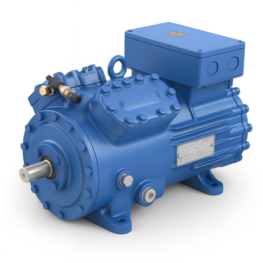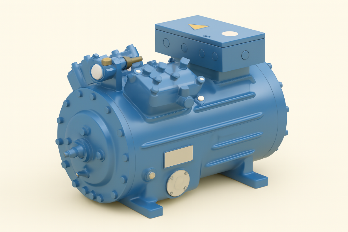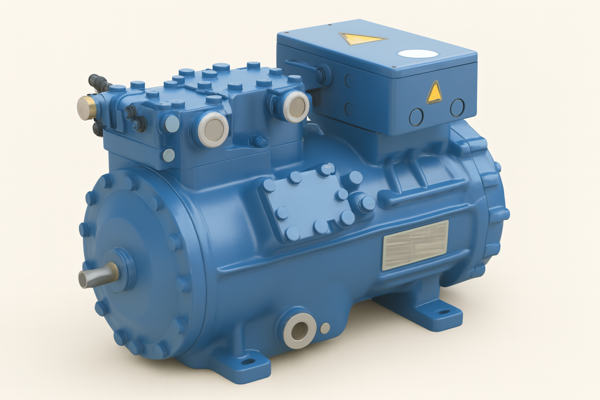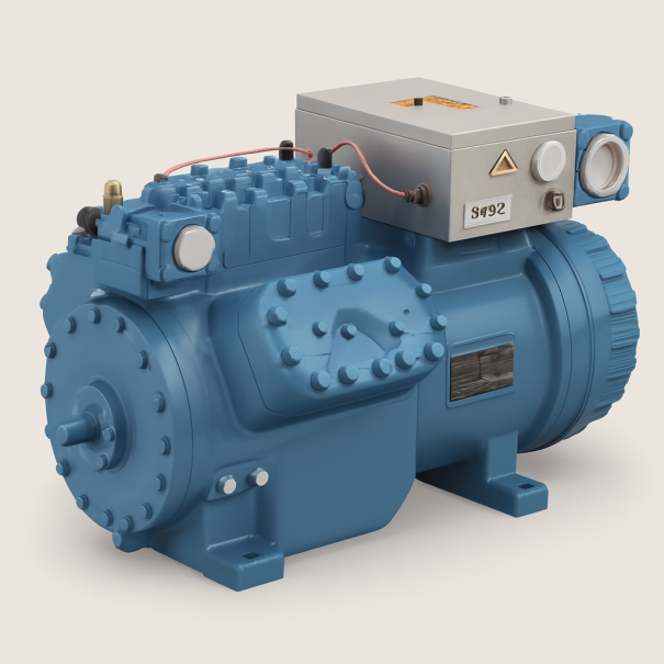 کمپرسور نیمه‌هرمتیک پیستونی (Piston Semi-Hermetic)پرکاربرد در سردخانه‌ها، صنایع غذایی، سیستم‌های تجاری.