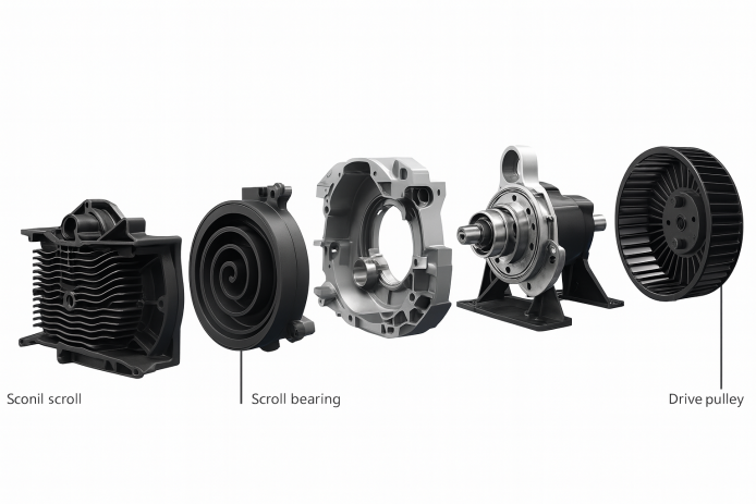کمپرسور اسکرول (Scroll): پرکاربردترین نوع، مناسب برای تهویه مطبوع خانگی و تجاری.