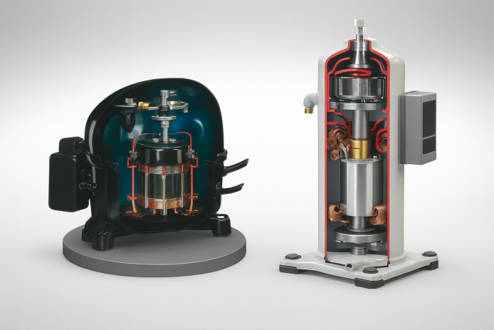 کمپرسور پیستونی هرمتیک و نیمه‌هرمتیک: مناسب سیستم‌های سرمایشی بزرگ‌تر و صنعتی.